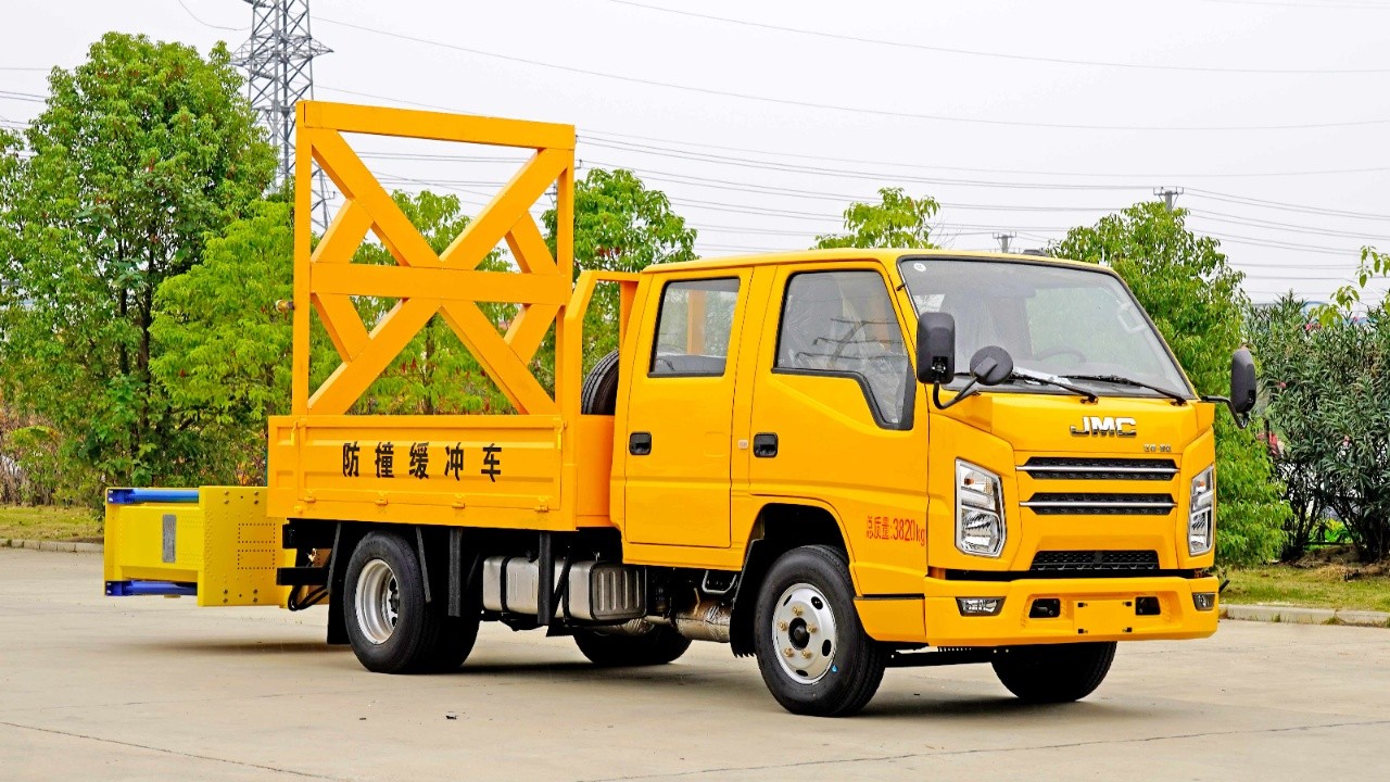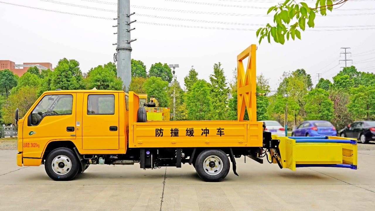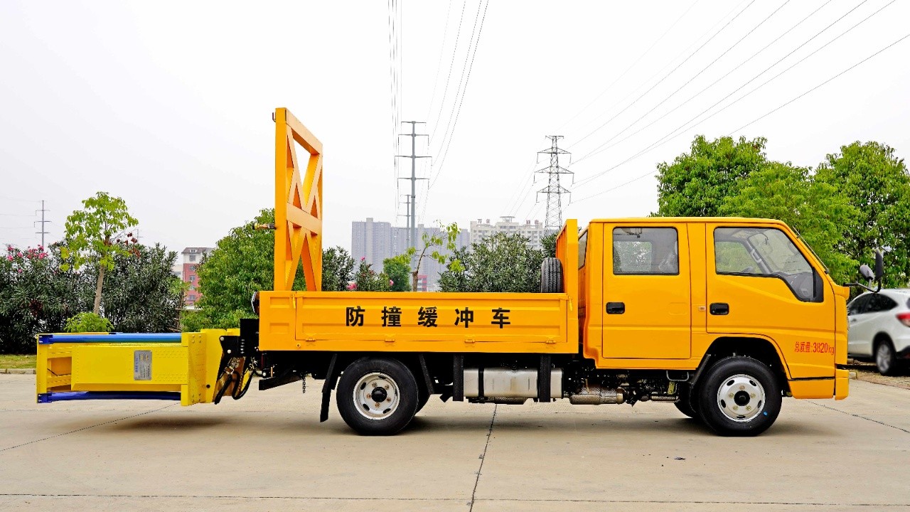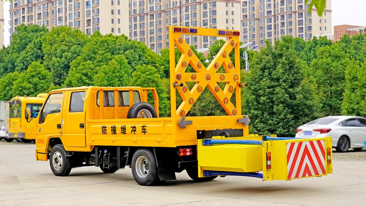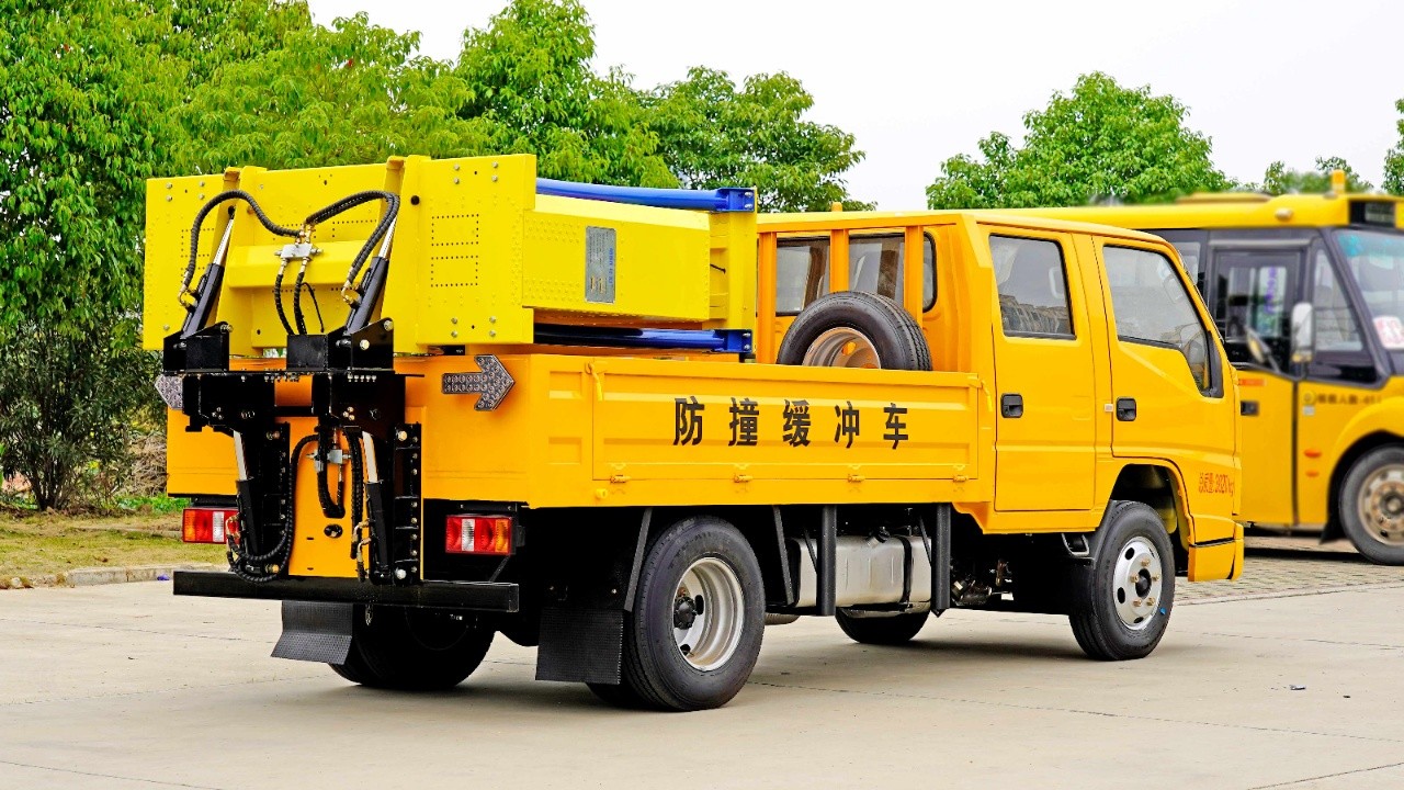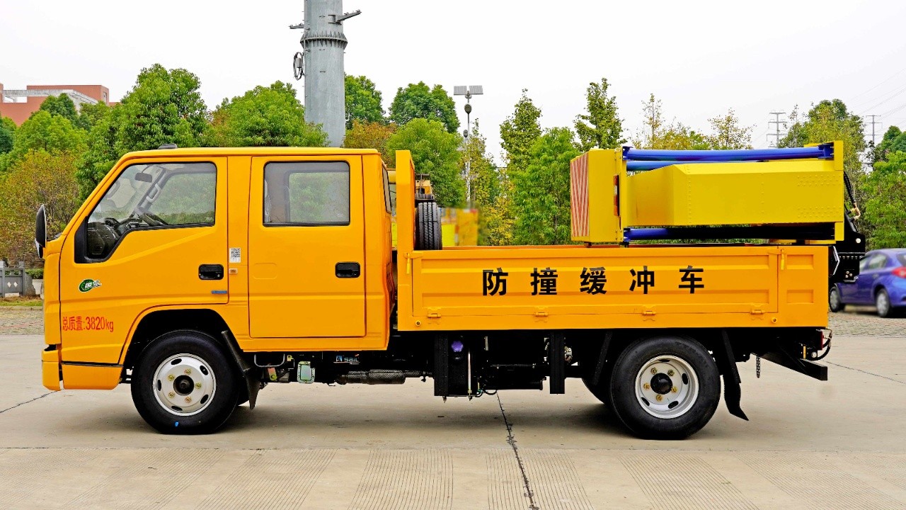 上裝配置:采用Q235國標邊3mm底板花紋板4mm厚,貨箱尺寸:2950mm長*1950mm寬*450mm高,箱體后部防撞緩沖模塊包采用國際知名技術產品70K防撞緩沖模塊,防撞緩沖吸能模塊主要由車載防撞緩沖墊和導向標志架組成,充當施工作業車輛后方的緩沖衛士。如若發生追尾事故,能夠在肇事車輛和前方施工作業區域之間構建一個緩沖區域,通過機具結構變形吸收撞擊的能量,限度地降低被保護人員及設備遭到碰撞的幾率。